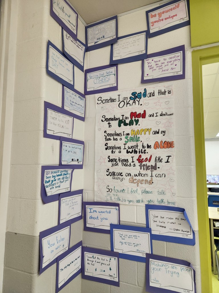 Reflection: Today was Day 2 in a classroom where I was able to connect with each student on mental health awareness and support programs in place at the school and outside of the school. I enjoyed listening to their constructive criticisms of support programs, of their experiences, and where they aim to be in the next 10 years. Since each student had a choice in decorating their artwork and choosing what to write, it allowed for their individuality to shine. In addition, it supports a positive learning environment where each student’s opinions are valued and heard.