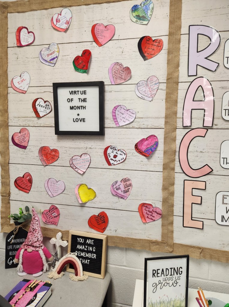 February’s virtue is Love—showing kindness, compassion, and respect to others just as Jesus taught us.